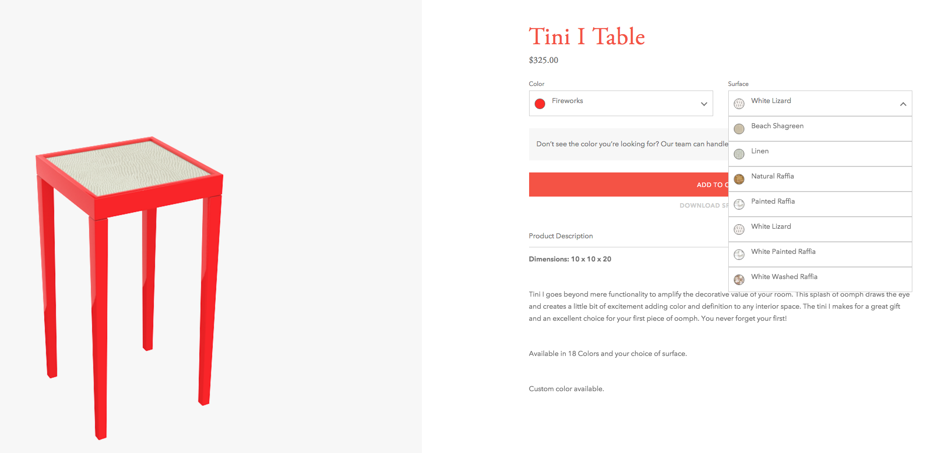 Given Shopify’s 100 variant limit and oomph’s regular need for thousands, there was a real obstacle in making custom furniture on-demand a reality. oomph was in need of a more satisfying shopping experience that represented the variant options for their products — including 18 colors and 8 surfaces, among many others — and their previous site did not offer a way for users to see every option.