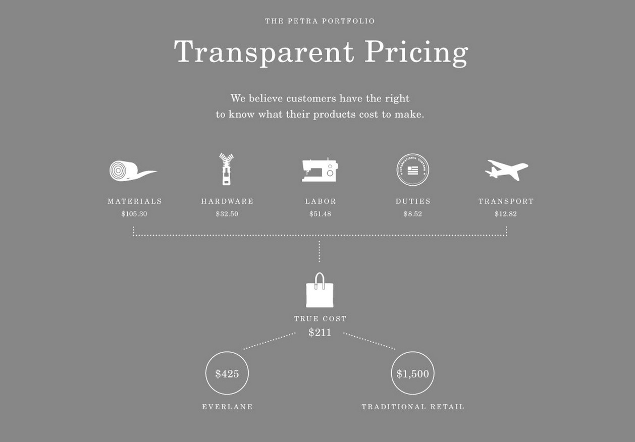 Inherent in a DNVB is its accessibility and transparency for consumers. Early adopters of supply chain transparency, like Everlane, have set the consumer's expectations for other brands to follow. Emerging DNVBs used supply chain transparency as a marketing tool early on in their growth stages. They would show straightforward graphics of the supply chain to show the true cost of production and the difference in price markups between traditional retail and DTC models.